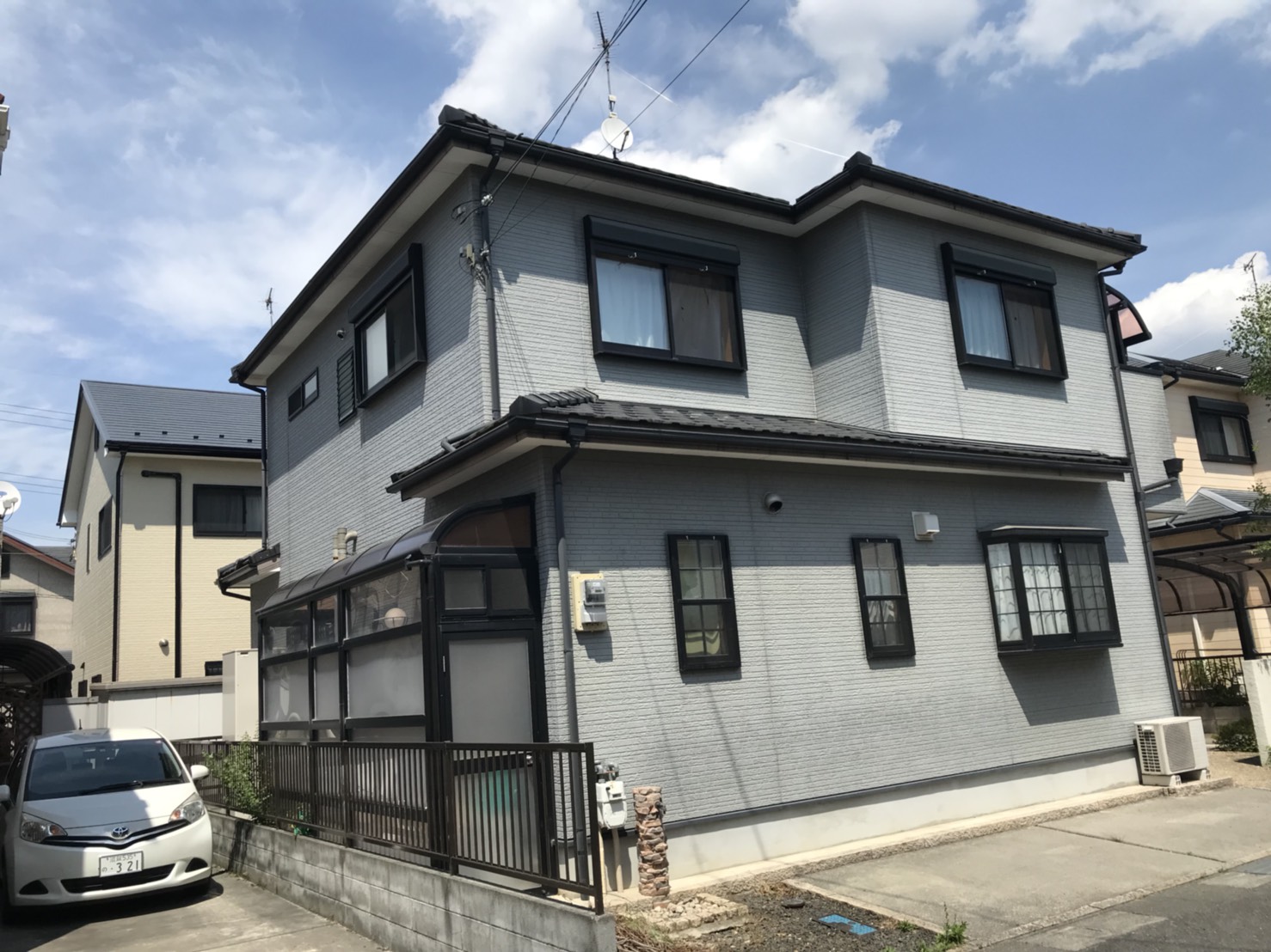 ビーズコート(艶消し超撥水性塗料)の調色で施工しました。 元々がグレー系の色だったので、そのまま濃いめのグレー系での施工予定でしたが、お子様のご意見で茶系に変更! 結果どっしりとした重厚感のある格好良い仕上りとなりました。 今回は建てた住宅メーカーとの比較の上、弊社を選んで頂き、誠にありがとうございました。近隣様でも数多く施工させて頂いた現場でもあります。今後のアフターフォローも踏まえて、どうぞ宜しくお願い致します。